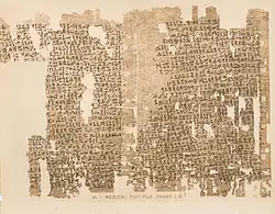 Die medizinischen Papyri aus Lahun werden in der Medizingeschichte auch oft unter der Bezeichnung Papyrus Kahun geführt. So werden der Medizin-Papyrus Kahun VI.1[1] und der Veterinär-Papyrus Kahun LV.2[2], beide altägyptischen Ursprungs, zwar zusammengefasst, in der Fachwelt aber dennoch voneinander unterschieden.[3] Sie bestehen aus kleineren Papyrusbruchstücken, die mit verschiedenen Aufzeichnungen überladen sind und allem Anschein nach zerrissen und weggeworfen wurden, nachdem man auf ihnen zusätzlich Rechnungen und Alltäglichkeiten notiert hatte.