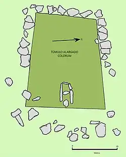 Die Kammer war etwa vier Meter lang, zwei Meter breit und drei Meter hoch. Der eckige Hügel war 20 m lang und vielleicht 15 m breit.