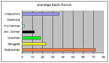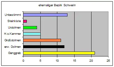 Im Rahmen einer Arbeitsgemeinschaft zwischen dem Institut für Ur- und Frühgeschichte der Deutschen Akademie der Wissenschaften zu Berlin und dem Museum für Ur- und Frühgeschichte Schwerin wurden zwischen 1965 und 1970 insgesamt 106 von 1145 nachweisbaren Megalithgräbern ausgegraben und die vorgefundenen Gräber dokumentiert und klassifiziert. Die Abbildungen zeigen die Anzahlen der verschiedenen Typen für die drei ehemaligen DDR-Bezirke auf dem Gebiet des früheren Landes Mecklenburg einschließlich Vorpommerns.[6]
