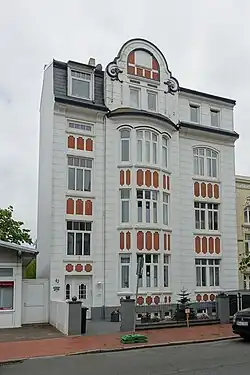 Das dreigeschossige traufständige repräsentative Gebäude auf Sockel mit schiefergedecktem Mansarddach wurde um 1904/10 gebaut. Die Straßenfassade wurde durch den mehrachsigen runden Erker gestaltet und darüber ein Dachhaus mit geschweiftem barockisierenden Giebel sowie mit backsteinsichtigen Brüstungsfeldern errichtet. Ansonsten ist es mit einer Scheinquaderung verputzt. Der Eingang befindet sich in einer abgesetzten Achse im Norden der straßenseitigen Westfassade. Die übrige Fassaden sind schlicht verputzt.