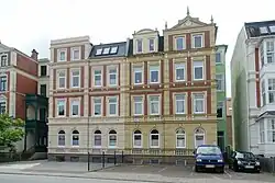 Nr. 41: Das dreigeschossige traufständige verputzte und verklinkerte Gebäude auf einem Keller, teils mit Mansarddach, mit viergeschossigem Seitenrisalit (hier mit klassizistischem Giebel) und vermutlich späterem Dachhaus wurde um 1898 gebaut. Die Straßenfassade wurde im Erdgeschoss gestaltet mit Putzelementen als Scheinquaderung und rundbogigen Fenstern sowie in den Obergeschossen mit Fenster- und Türrahmungen, zwei geschossteilende Gesimsbänder sowie dem Traufgesims. Der seitliche Eingang ist zurückversetzt.[2]