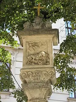 Vor dem Haus Nummer 3 befindet sich eine barocke Votivsäule. Ein Vierkantsockel trägt eine Rundsäule, auf der ein Quader mit zwei Bildreliefs aufgesetzt ist. Eines zeigt die Bekehrung des Apostels Paulus und trägt die Jahreszahl 1687, das andere Relief stellt einen Gnadenstuhl dar und stammt von 1756.