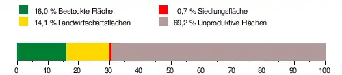 Es besteht zu 16,0 % aus bestockter Fläche, zu 14,1 % aus Landwirtschaftsfläche, zu 0,7 % aus Siedlungsfläche und zu 69,2 % aus unproduktiven Flächen.