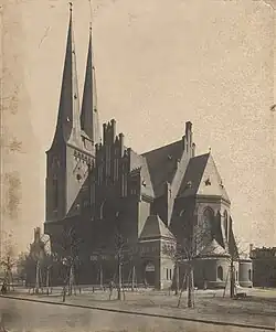 Die Hallenkirche in norddeutscher Backsteingotik besaß ein wuchtiges Westwerk, das mit zwei Turmhelmen abgeschlossen und 80 Meter hoch war. Der Grundriss der Kirche hatte die Form eines lateinischen Kreuzes. Das Kirchengestühl bot einschließlich der beiden Seitenschiffe und drei Emporen insgesamt 1250 Gläubigen Platz. Ein Wimperg mit Dreipass bekrönte das Portal, dessen Gewände die beiden Eingangstüren begrenzte. Die Gewände der Bogenfenster liefen leicht spitz zu. An das Langhaus mit einer Länge von 51 Metern schloss sich der polygonale Chor an. Er wurde eingefasst von einem Kranz aus Kapellen. Im Westwerk befanden sich drei Bronzeglocken. Das Innere der Kirche war kunstvoll ausgemalt.