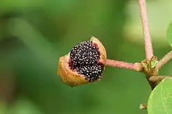 Die vielsamigen, unregelmäßig öffnenden Kapseln oder Beeren (Scheinfrucht) mit den Blütenbecherspitzen sind urnenförmig und messen 6 bis 15 Millimeter in der Länge und 6 bis 12 Millimeter in der Breite. Sie sind fleischig und dicht schuppenartig borstig. Die vielen, sehr kleinen Samen, im dunkel-violetten Fruchtfleisch, sind teils fertil und beige, diese sind etwas größer, wie die unfruchtbaren, anders geformten, dunklen.[2] Die Blütezeit erstreckt sich von Februar bis August, die Fruchtreife von Juli bis Dezember.