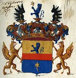 Blasonierung: Von Gold über Blau geteilt; über die Mitte des Schildes ein roter Balken. Im oberen Feld wächst ein rechtsgewendeter vorwärtssehender doppelschwänziger blauer Löwe; im unteren Feld eine fünfstrahliger goldener Stern mit abwärtsgekehrten, geschlängelten Schweif. Auf dem Schild die Grafenkrone, darüber drei gekrönte Helme mit blau-goldenen Helmdecken: I. und III. je einen mit den Sachsen einwärtsgewendeten schwarzen Flügel, der mit einem goldenen Kleestängel belegt ist; II. der Löwe, der hier mit der rechten Pranke den goldenen Kometstern am Schweif hält. Als Schildhalter zwei einwärtssehende goldene Greife.[8]