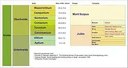 Alle diese Werksteine gehören nach stratigraphischen Gesichtspunkten der Judäa-Gruppe (Kreide) an und weisen eine wechselnde mineralische Zusammensetzung auf. In den meisten Fällen besitzen sie eine gelbe bis beige Farbe, im Einzelfall auch ins Rötliche tendierend (Mizzi Ahmar / Kefar Veradim Formation/Cenoman) oder ins Graue verlaufend (Mizzi Yahudi / Kefar Veradim Formation/Cenoman).