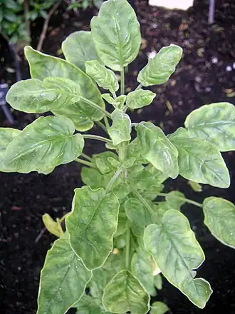 Die Laubblätter stehen in wechselständigen Paaren in einer 3/5 Phyllotaxis. An den Spitzen der Zweige, vor allem an blütentragenden Zweigen stehen sie in dichten Gruppen. Die Blattspreite ist etwas fleischig, eng elliptisch bis eiförmig und hat eine Länge von 1,5 bis 4,5 cm und eine Breite von 1 bis 3 cm, die Blattstiele werden 1 bis 3 cm lang. An Zweigen, die keine Blüten tragen, sind die Laubblätter meist etwas größer und werden dort bis zu 6 cm lang und 4 cm breit, die Blattstiele erreichen dann eine Länge zwischen 2,8 und 8 cm. Nach vorn hin ist die Blattspreite abgeschnitten-abgerundet bis zugespitzt, die Basis ist herzförmig bis abgeschnitten, der Blattrand ist ganzrandig. Die Blätter sind gleichmäßig fein mit einfachen, einreihigen, drüsigen und nur etwa 0,01 mm langen Trichomen behaart, wodurch die Blätter sich leicht klebrig anfassen. Der Geruch der Blätter wird als tabakähnlich oder ähnlich dem Geruch von Blättern der Blasenkirschen (Physalis) beschrieben, auch der Vergleich mit dem Geruch durchgeschwitzter Füße wurde herangezogen.