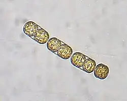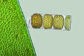 Melosira moniliformis an eine grüne Pflanze angeheftet. | ||||||||||||