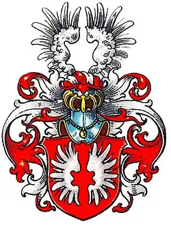 Blasonierung: In Rot ein offener silberner Flug. Auf dem rot-silbern bewulsteten Helm mit rot-silbernen Helmdecken der offene silberne Flug.[1]