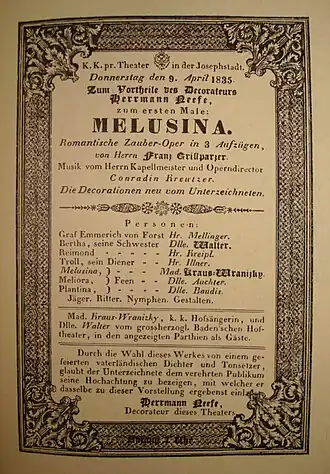 „Vermuthlich werden Sie schon durch öffentliche Blätter erfahren haben, daß meine neueste Oper, Melusina – Text von Grillparzer – am 27ten vorig. M: zum 1tenmal – und zwar mit grossem und einstimmigem Beyfall gegeben wurde. Heute sollte die 1te Wiederhohlung seyn, allein es wurde die 2te Sängerin krank, und nun wurde es auf übermorgen verschoben – jedoch waren heute früh schon Alle Logen und Sitze verkauft! – Bis auf etwelche Störungen im Arrangements – Gruppierung und Decoration durfte man die Vorstellung, musikalisch betrachtet, vorzüglich nennen. – Die Ouverture wurde stürmend da Capo verlangt, und ich selbst wurde am Schlusse des 1ten und 3ten Acktes gerufen. – Alle hiesigen Blätter und Journale geben sehr vortheilhafte Recensionen – nur wird hie und da der Dichter etwas mitgenohmen – indessen was man ihm nach dieser 1ten Vorstellung zur Last legt – kommt mehr auf die Rechnung des Hrn. Regißeurs – und bey der 2ten Vorstellung werden diese Mißstände alle gehoben seyn – und man wird auch dem Dichter mehr Gerechtigkeit wiederfahren lassen müssen! Daß diese Oper an allen deutschen Bühnen zur Aufführung kommen wird, dessen bin ich fest überzeugt, eben so, daß sie sich auf dem Repertoir erhalten soll – ich darf es selbst – ohne Selbstlob – niederschreiben – diese Composition ist sehr gelungen, und hat die ächt romantische Farbe – es hat liebliche Cavatinen – 2 grosse imposante Arien – oder vielmehr Szenen – ein[en] ganz vorzüglich gelungenen Canon und Quartett – und 3 höchst imposante und karackteristische grosse Finales! – – was soll man mehr!“