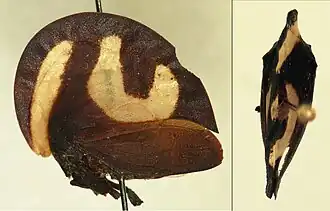 Membracis foliatafasciata (Syn.: M. foliata c-album) von der Seite und von oben | ||||||||||||