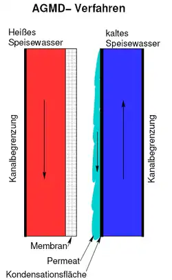 Bei dem Air Gap MD-Verfahren entspricht der Aufbau des Verdampferkanals dem des DCMD-Verfahrens, während der Permeatraum zwischen der Permeatseite der Membran und einer gekühlten Wandung liegt und mit Luft gefüllt ist. Der durch die Membran hindurch permeierende Wasserdampf muss zusätzlich diesen Luftspalt überwinden, bevor er an der kälteren Wandung kondensiert. Der Vorteil dieses Verfahrens besteht darin, dass der Luftspalt eine gute thermische Isolation zum Kondensator bildet, wodurch die Wärmeleitungsverluste deutlich reduziert werden können. Der Nachteil ist allerdings, dass der Luftspalt für den Stofftransport einen zusätzlichen Widerstand darstellt, wodurch die flächenspezifische Permeatleistung gegenüber dem DCMD-Verfahren zurückgeht. Ein weiterer Vorteil der AGMD gegenüber der DCMD besteht darin, dass auch flüchtige Stoffe mit niedriger Oberflächenspannung wie z. B Alkohol oder andere Lösemittel aus wässrigen Lösungen abgetrennt werden können, da bei der AGMD kein Kontakt zwischen dem flüssigen Permeat und der Membran besteht, was deren Benetzung zur Folge hätte.