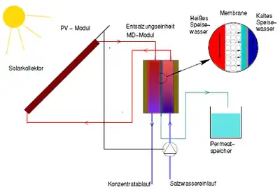 Die Membrandestillation, besonders in der Ausführung als Spiralwickelmodul nach einem Patent der Firma GORE aus dem Jahr 1985, ist bestens für kompakte, vollkommen solarbetriebene Entsalzungsanlagen für kleine bis mittlere Tageskapazitäten ≤ 10.000 l/Tag geeignet. Im Rahmen des 2003 begonnenen EU-Projekts MEMDIS wurden am Fraunhofer-Institut für Solare Energiesysteme (ISE) zusammen mit Projektpartnern begonnen, MD-Module zu konstruieren und zwei verschiedene solar betriebene Systeme zu entwickeln, zu installieren und zu untersuchen. Bei dem ersten System handelt es sich um eine als Kompaktsystem bezeichnete Anlage zur Erzeugung von ca. 100–120 l/Tag Trinkwasser aus Meer- oder Brackwasser. Zielsetzung bei diesem Anlagendesign war es vor allem, ein einfach aufgebautes, energieautarkes, wartungsfreies und robustes System für Zielmärkte in infrastrukturschwachen Gebieten der ariden und semiariden Zonen zu schaffen. Das zweite System war eine als Zweikreissystem bezeichnete Anlage mit einer Kapazität von etwa 2.000 l/Tag. Der Kollektorkreis wurde hier von dem Entsalzungskreis durch einen salzwasserbeständigen Wärmeüberträger entkoppelt.[1] Ausgehend von diesen beiden Systemen wurden mehrere Prototypenanlagen entwickelt, installiert und vermessen.