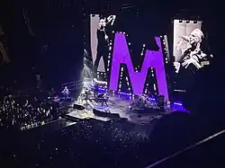 Das Bühnenbild prägten im Hintergrund zwei LED-Bildschirme auf der linken und rechten Seite, sowie ein großes „M“ in der Bühnenmitte, dass für die Begriffe „Memento“ und „Mori“ stand und in verschiedenen Farben je nach Stimmung des jeweiligen Liedes ruhiger oder hektischer pulsierte.