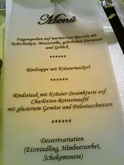 Als Menü (im 19. Jahrhundert aus französisch menu für „klein“, „Kleinigkeit“ entlehnt[1]) bezeichnet man eine Kombination von Speisen, die aus mehreren Gängen besteht.