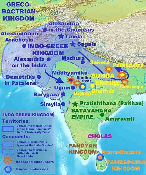 - ↑ Cuthbert Collin Davies: An Historical Atlas of the Indian Peninsula. 2nd edition. Oxford Univ. Pr., London 1959; Abodh K. Narain: The Coin Types of the Indo-Greek Kings. Ares, Chicago IL 1976, ISBN 0-89005-109-7; Hans Erich Stier, Ekkehard Aner Ernst Kirsten: Westermanns grosser Atlas zur Weltgeschichte. Vorzeit. Altertum. Mittelalter. Neuzeit. 10. Auflage. Westermann, Braunschweig 1978, ISBN 3-14-100919-8.