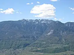 Der (schneelose) nördliche Teil des Mendelkamms von Südosten: Die Kammsenke etwas links der Mitte ist der Mendelpass, der Berg in der Bildmitte der Penegal, rechts der Gantkofel; im Hintergrund die schneebedeckten Gipfel der Ortler- und Ötztaler Alpen. | |