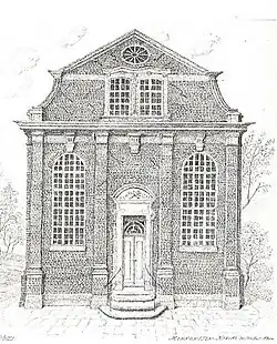 In den ersten Jahren versammelte sich die Gemeinde noch in Privathäusern. Erst im Jahr 1675 errichteten mennonitische Walfänger aus fünf Prozent des Erlöses einer Walfangsaison eine Holzkirche an der Großen Freiheit. Die Große Freiheit bezieht ihren Namen von den Religions- und Gewerbefreiheiten, die Glaubensgemeinschaften und zunftfreie Handwerker damals in Altona genossen. Beim Schwedenbrand im Großen Nordischen Krieg wurde die Holzkirche zusammen mit großen Teilen der Stadt Altona zerstört. Doch schon 1715 wurde an gleicher Stelle eine neue Steinkirche aufgebaut, die bis 1915 von der Gemeinde genutzt wurde. Bei dieser vom Altonaer Stadtbaumeister Claus Stallknecht erbauten Kirche handelte es sich um einen einschiffigen, turmlosen Backsteinbau mit pfannengedecktem Mansarddach und einem schlichten Kirchenraum mit Tonnendecke. Die Fassade war barock mit Sandsteinen ausgestaltet.[1] Wie andere täuferisch-mennonitische Kirchen lag diese erste Steinkirche noch nicht unmittelbar an der Straßenfront. Vor dem Kirchengebäude entstanden 1772 und 1850 Gemeinde- und Pfarrhäuser, die die Kirche auch baulich von der Straßenlinie trennten. Nachdem sich das Viertel um die Große Freiheit jedoch immer deutlicher in ein Amüsierviertel wandelte, entstanden erste Pläne für einen Umzug der Gemeinde. 1915 wurde schließlich die neue Kirche an der Mennonitenstraße in Altona-Nord eingeweiht, die bis heute der Gemeinde als Versammlungsort dient. Kirche und Gemeindehäuser an der Großen Freiheit 73/75 wurden an die Stadt verkauft, die das Gebäudeensemble in den folgenden Jahren an die Hamburger Großstadt-Mission übergab.[2] Im Zweiten Weltkrieg wurde das Kirchengebäude an der Großen Freiheit schließlich komplett zerstört. Nur Mauerreste wie die ziegelgemauerte Apsis konnten bei späteren Ausgrabungen noch dokumentiert werden.[3] Die Gemeindehäuser blieben jedoch bestehen und stehen inzwischen unter Denkmalschutz.[4] Bis 1795 hielt die Gemeinde noch am Niederländischen als Gottesdienstsprache fest.