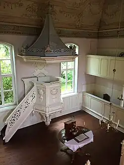 Die Innenarchitektur ist übrigens einzigartig unter den deutschen Mennonitenkirchen vom Rokoko geprägt. Einen besonderen Blickfang bildet – abgesehen von Kanzel und Abendmahlstisch – der Deckenschmuck, ein Schablonengemälde aus dem Jahr 1900.