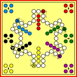 Jeder Spieler erhält zu Beginn vier Steine einer Farbe. Einen Stein setzt er auf das A-Feld seiner Farbe,[9] die anderen drei auf die gleichfarbigen B-Felder. Es wird einmal gewürfelt. Wer die höchste Zahl würfelt, beginnt. Gespielt wird reihum im Uhrzeigersinn.[10]