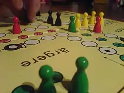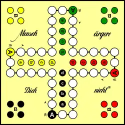 Auf dem Spielbrett für maximal vier Personen sind die vier verschiedenfarbigen Startfelder (in der Regel rote, schwarze, grüne und gelbe) mit jeweils vier Positionen (Anzahl der Spielfiguren pro Spieler) in den Ecken verzeichnet. Das A-Feld („Anfang“ (auch S-Feld („Start“)); siehe Abbildung 2) kennzeichnet die Position, die ein durch einen Sechserwurf neu eingewürfelter Spielstein zu Beginn einnimmt. Der Pfeil gibt die Laufrichtung an. Nach einem Umlauf muss der Spielstein dann in die vier jeweils passenden farbigen Zielfelder ziehen. Das Feld für sechs Personen ist analog gestaltet.