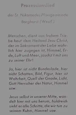 - ↑ Prozessions-Büchlein der Stadt Münster 5. Auflage; zusammengestellt von E. Peters, Pfarrkaplan an Liebfrauen-Überwasser Münster; Regensberg-Druckerei Münster 1885; S. 50 u. 125.