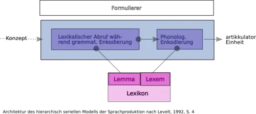 Auf Willem Levelt geht die Theorie der hierarchisch-seriellen Modelle zur Sprachproduktion zurück. Dabei unterschied er 1989 zwischen drei verschiedenen Ebenen, der konzeptuellen, der lexikalischen und der artikulatorischen. Erfolgt auf der lexikalischen Ebene ein Zugriff auf das innere Lexikon, dann erfolgt dieser in zwei Schritten: Zunächst wird die Wortinformation (Lemma) abgerufen mit seinen Informationen zu Semantik und Syntax und dann das zugehörige Lexem, welches Auskunft gibt über Phonologie und Morphologie des Lemmas. Das Zungenspitzenphänomen und das Phänomen der Versprecher, welche entweder auf Wortvertauschungen auf der Lexemebene oder auf Lautvertauschungen auf der Lemmaebene erfolgen, gelten als experimentelle Evidenz dieser Aufteilung.[5]
