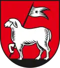 Blasonierung: „In Rot auf schwarzem Schildfuß ein silbernes Gotteslamm, eine schwarze Fahnenstange mit einer zweizipfligen und mit einem fünfstrahligen schwarzen Stern belegten silbernen Fahne tragend.“ |