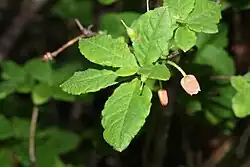 Die wechselständigen und an den Zweigenden gehäuft angeordneten Laubblätter sind in Blattstiel und Blattspreite gegliedert. Der Blattstiel ist 2 bis 4 Millimeter lang. Die länglich-elliptischen bis oval-elliptischen, 3 bis 6 Zentimeter großen sitzen an einem Die Blattränder sind drüsig-gewimpert, das heißt, es stehen Haare seitwärts vom Blattrand ab. Die Blattunterseite ist hellgrün gefärbt, während die Blattoberseite dicht-drüsig oder behaart ist.[1]