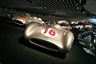 Nach dem Ende des Zweiten Weltkriegs und der Wiederzulassung Deutschlands in den internationalen Automobilsport errang Mercedes-Benz als erster deutscher Hersteller mit dem argentinischen Rennfahrer Juan Manuel Fangio 1954 und 1955 zwei Weltmeistertitel in der Formel 1. Auch bei Sportwagenrennen wie der Carrera Panamericana, Mille Miglia oder in Le Mans war die Marke ab 1952 erfolgreich – mit dem Gewinn der Sportwagen-WM 1955 als vorläufigem Höhepunkt. Dieser Titelgewinn wurde jedoch durch den tragischen Unfall in Le Mans 1955 des Mercedes-Piloten Pierre Levegh überschattet, der mit 84 Toten bislang schwersten Katastrophe im Motorsport.