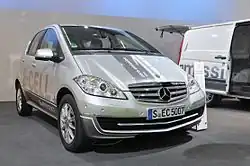 Im Oktober 1997 führte Mercedes-Benz die A-Klasse mit Verbrennungsmotoren in den Markt ein. Auf eine Serienfertigung der elektrischen A-Klasse wurde aus wirtschaftlichen Gründen verzichtet. Die Elektroversion wurde ab 1998 zur Dauererprobung eingesetzt.[35] Sie schuf mit den Versuchsfahrzeugen NECAR die Basis für die heutigen Entwicklungen E-Cell und F-Cell mit alternativen Antriebssystemen. Gleichwohl verpasste Mercedes-Benz wie alle anderen deutschen Auto-Hersteller den Anschluss an die internationale Entwicklung des Elektroautos, die ab 2006 mit dem ersten Tesla-Modell einen Entwicklungsschub erlebte. Immerhin kam es ab 2010 dann doch noch zu einer Kleinserien-Fertigung der A-Klasse mit Elektroantrieb.[36]