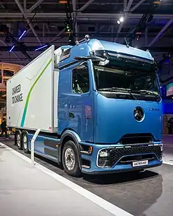 Seit 2022 wird der batterieelektrische Lkw eActros 300 bzw. eActros 400 als Sattelzugmaschine und Fahrgestell für den Verteilerverkehr angeboten. Akkus mit einer Gesamtkapazität von 336 kWh ermöglichen etwa 330 km Reichweite; 448 kWh ermöglichen etwa 400 km.[28] Der eActros 300 und eActros 400 wird ausschließlich mit dem M Classic Space-Führerhaus (ehemals Antos) ausgeliefert. Der Antriebsstrang besteht aus einem permanenterregten Synchronmotor mit 330 kW Dauerleistung, sowie einem Vierganggetriebe (je zwei Vorwärts- und Rückwärtsgänge).