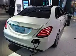 Der Ottomotor-Plug-in-Hybrid C 350 e verfügt über eine in das Getriebegehäuse integrierte E-Maschine mit einer Maximalleistung von 60 kW und einem Drehmoment von 340 Nm. Im Zusammenspiel mit dem Vierzylinder-Benzinmotor M 274 DEH 20 LA ergibt sich eine Systemleistung von 205 kW (279 PS) und ein Systemdrehmoment von 600 Nm.[17] Nach NEFZ kann eine rein elektrische Reichweite von 31 km erreicht werden. Da Nebenaggregate wie die Wasserpumpe, die Vakuumpumpe, die Lenkhilfepumpe und der Klimakompressor elektrifiziert wurden, entfiel der konventionelle Riementrieb.[18] Der Generator entfiel ebenfalls, das 12-V-Bordnetz wird über einen DC/DC-Wandler aus dem Hochspannungsbordnetz gespeist.[18] Hinter der Hinterachse ist die ca. 100 kg schwere, kühlmittelgekühlte Lithium-Ionen-Batterie mit 6,38 kWh Energieinhalt untergebracht, wodurch sich das Gepäckraumvolumen von 480 auf 335 Liter (Limousine) bzw. von 490–1510 auf 450–1470 Liter (T-Modell) verringert.[19][20] Es handelt sich um einen aus 88 in Serie verschalteten Zellen (22 Ah, 3,3 V) bestehenden Lithium-Eisenphosphat-Akkumulator mit einer Nennspannung von 290 V.[18] Insgesamt ist der C 350 e 230 kg schwerer als der vergleichbare C 250.[17]