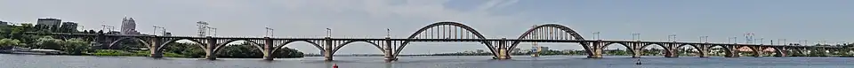 Die zweitälteste Brücke der Stadt[1] und die erste Eisenbahn-Bogenbrücke in der Sowjetunion war zum Zeitpunkt ihrer Konstruktion die größte Bogenbrücke Europas und wird als ein einzigartiges Ingenieurbauwerk im Register der Architekturdenkmäler der Ukraine aufgeführt (FN P-86, 1 bis 493 PS, op. 1).[2]