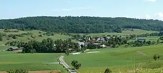 ![]() Blick vom Hammerberg nach Nordnordosten schräg das Lanzenbachtal hinauf mit Merkelbach in der Talmitte und Schneckenweiler leicht rechts und wenig dahinter