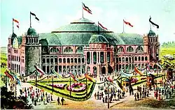 Grafische Darstellung der Frankfurter Festhalle auf einer Ansichtskarte zur Eröffnung 1909