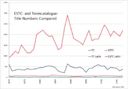 Beim Vergleich der Zahlen mit den Angaben des ESTC bestätigt sich, dass die Term Catalogues hoch selektiv blieben. Der ESTC listet Titel in der Schwankungsbreite von 13.000 bis 23,000 Einträgen für die einzelnen Jahrzehnte. Die Term Catalogue Zahlen bleiben bei 20 %−30 % dieser Angaben. Die Kataloge der 1690s weisen die meisten Einträge auf – das Jahrzehnt fällt im ESTC dagegen eher hinter die 1680er zurück. Das letzte Jahrzehnt des Katalogs ist unterrepräsentiert, nachdem die Fortführung des Katalogs nach 1708 zunehmend stockte. Grundsätzlich kommt das politische und religiöse Tagesschrifttum in den Katalogen zu kurz.