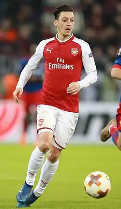 Am 2. September 2013 wechselte Özil am letzten Tag der Transferperiode überraschend in die Premier League zum FC Arsenal, die Ablösesumme soll bei rund 50 Mio. Euro gelegen haben.[37] Mit seinem Wechsel wurde er zum teuersten Einkauf des FC Arsenal, zum teuersten Verkauf von Real Madrid sowie zum bis dahin teuersten deutschen Spieler (dieser Rekord soll 2016 von Leroy Sané eingestellt worden sein[38]).[39][40] In London traf er auf Lukas Podolski und Per Mertesacker, die er bereits aus der deutschen Nationalmannschaft kannte. Özil war sofort Stammspieler und besetzte den Raum hinter der alleinigen Spitze, die meist Olivier Giroud bildete. Er scheiterte mit Arsenal im Achtelfinale der Champions League am FC Bayern, dafür war man im Endspiel des FA-Cups erfolgreich. Im Sommer 2014 kehrte der Deutschtürke als Weltmeister auf die Insel zurück. Eine Knieverletzung setzte Özil zwischen Oktober 2014 und Januar 2015 außer Gefecht, mit den Gunners konnte er allerdings erneut auf einem Europacuprang landen und den englischen Pokal verteidigen. 2015/16 gewann Özil mit Arsenal lediglich den nationalen Supercup, dafür blieb er weitestgehend verletzungsfrei und absolvierte sein statistisch bestes Spieljahr. Acht wettbewerbsübergreifenden Treffern standen 20 Vorlagen gegenüber, davon 19 in der Premier League, wobei der Zweitplatzierte, Christian Eriksen, sechs Assists weniger vorzuweisen hatte.