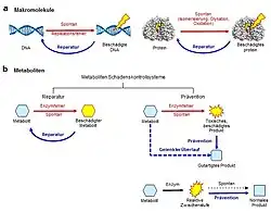 Beschädigte Metaboliten (durch enzymatische oder chemische Beschädigung) haben einen veränderten, meist geringeren Nutzen in der Zelle und sind oftmals giftig. Um zelluläre Vergiftungen zu vermeiden, die durch Anhäufung von beschädigten Metaboliten auftreten können, haben Organismen Mechanismen entwickelt. Diese Schadenkontrollsysteme können ein oder mehrere spezifische Enzyme umfassen.[5][6] Eine Schädigung an Makromolekülen durch spontane Reaktionen oder enzymatische Fehler kann durch enzymatische Kontrollsysteme repariert werden. Das gleiche Prinzip gilt auch für Metabolite die anfällig für Schädigung durch spontane chemische Reaktionen oder enzymatische Fehler sind. Metaboliten Schadenskontrollsysteme können entweder den Schaden direkt reparieren (Reparatur) oder ihn verhindern (Prävention). Ein gelenkter Überlauf ist ein Spezialfall der Prävention. Es werden drei Kategorien von Schadenskontrollsystemen unterschieden: