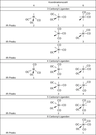 Eine nützliche Methode zur Untersuchung von Metallcarbonylen ist die Kernspinresonanzspektroskopie von Kohlenstoffkernen wie 13C, Sauerstoffkernen wie 17O oder Metallkernen wie 195Pt, in gemischten Carbonylkomplexen von Phosphorkernen 31P und Wasserstoffkernen 1H.[75] Zur Verbesserung der Auflösung kommen bei der 13C-NMR-Spektroskopie Komplexe mit künstlich angereicherten 13C-Kohlenstoffmonoxidliganden zum Einsatz. Typische Werte der chemischen Verschiebung liegen für terminal gebundene Liganden bei 150 bis 220 ppm, für verbrückende Liganden bei 230 bis 280 ppm.[76] Die Abschirmung steigt mit der Ordnungszahl des Zentralatoms.