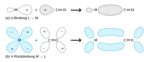 Metallcarbonyle werden durch die synergistischen σ-Donor/π-Akzeptor-Wechselwirkungen des Kohlenstoffmonoxids mit dem Metall besonders stabilisiert. Durch diese Wechselwirkungen wird die Elektronendichte vom gefüllten σ*-Orbital der C-O-Bindung, dem freien Elektronenpaar am C-Atom, in die symmetrieäquivalenten, leeren d-Orbitale des Metalls und von gefüllten Metallorbitalen in die leeren π*-Orbitale der C-O-Mehrfachbindung verschoben.