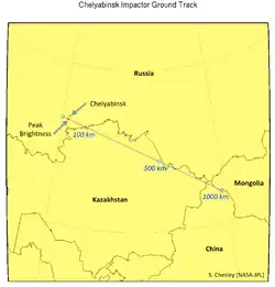 Der Meteor von Tscheljabinsk war ein am 15. Februar 2013 um etwa 9:20 Uhr Ortszeit (4:20 Uhr MEZ)[3] weithin sichtbarer Meteor in der Tscheljabinsker Oblast rund um die Stadt Tscheljabinsk im russischen Ural,[4] nachdem ein Meteoroid bzw. kleiner Asteroid in die Erdatmosphäre eingetreten war. Nach Rekonstruktion der Flugbahn zählte er mit hoher Wahrscheinlichkeit zur Gruppe der erdnahen Asteroiden vom Apollo-Typ.[5][6]