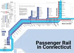 Schienenverkehr in Connecticut nach Betreiber (2024). Dunkelblau: Metro-North, Hellblau: Amtrak, Rot: CTRail
