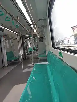 Die Metro Kochi nutzt Alstom-Metropolis-Zuggarnituren.[118][119] Die Wagen haben eine Höhe von 3,90 Metern und jeder Zug aus drei Wagen weist eine Länge von 65 Metern auf.[120] Jeder Wagen verfügt über drei breite Türen mit automatischem Öffnungs- und Schließmechanismus.[121] Die Bahnsteige an den Stationen sind 70 Meter lang.[120] In der ersten Betriebsphase der U-Bahn werden insgesamt 22 Züge eingesetzt.[122] Die Kapazität der Züge beträgt 975 Passagiere.[121]