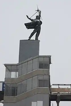 Auf der westlichen Seite wird sie von zwei zu den Bahnsteigen führenden Treppenhäusern begrenzt, die von Monumetalfiguren gekrönt sind und an die der auf einer separaten Brücke liegende U-Bahnhof Dnipro anschließt.