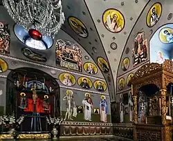 Die Metropolitankirche ist mit zehn Meter Breite und 20 Meter Länge eher klein.[3] Das Kirchengebäude ist nicht orientiert, sondern erstreckt sich von Nordwesten nach Südosten. Der Bau umfasst drei kreuzgewölbte Joche. Eine hölzerne Ikonostasis im nördlichen Joch trennt das Allerheiligste vom übrigen Kirchenraum. Das Kreuzgewölbe des mittleren Jochs schmückt ein großes Fresco des Christos Pantokrator über einem prächtigen Kandelaber. Der Bau ist in den nach Norden ansteigenden Hang gebaut. Da die Westwand zugleich die äußere Ummauerung des Dair al-Muṭrāniyya bildet, weist die Metropolitankirche wenige Fenster auf. Zusammen mit dem grauen Grundton der Gewölbeausmalung und der nicht eben üppigen Ausleuchtung vermittelt der Innenraum eine gedämmte Stimmung.