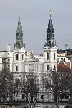 Die Kirche wurde von den orthodoxen Griechen der Stadt gegründet. Das zweitürmige Gebäude wurde nach Plänen von József Jung in den Jahren von 1791 bis 1801 erbaut. Finanziert wurden die Bauarbeiten durch die Unterstützung von reichen Händlerfamilien in Pest und Buda. Die Ikonostase, ein Werk des Holzschnitzers Nikolaosz Ioánnu Talidorosz aus Eger, wurde um 1809 fertiggestellt. Die endgültige Form der Turmkuppel und der Fassade erhielt die Kirche 1873 durch den Architekten Miklós Ybl. Während der Belagerung von Budapest im Zweiten Weltkrieg wurde die Kirche stark beschädigt; 1945 stürzte einer der Kirchtürme ein. Die Fassade der zerstörten Kirche wurde 1953 restauriert, eine Innenrestaurierung erfolgte in den Jahren von 1991 bis 1996; der fehlende Turm wurde 2008 wieder aufgebaut.