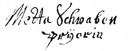 Inschrift ihrer Grabplatte: Metta von Schwaben 1709 Inschrift vertieft, zunächst Spruch 2. Tim. 4. V. 7 u. 8, dann: ANNO 1694 / IHRES ALTERS 73 JAHR 3 MONAT 7 TAGE, dann Spruch Psalm 4 weiter: AUS DEM HAUSE LINDAUW WELCHE GEBOHREN / 1636 D. 21 JUNII METTA VON SCHWABEN UND SELIG / VERSTORBEN DEN 28. SEPT. PREJÖRIN AO ‚1709 NACHDEM / SIE 35 JAHR EINE CONVENTUALIN DIESES HOCHADELIGEN / KLOSTERS GEWE-SEN UND 15 JAHR DEM PRIORIN AMPT / RÜHMLICHST VORGESTANDEN. In der Mitte das Wappen mit der Unterschrift: HIR UNTER RUHEN DIE SCHWABEN