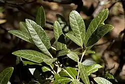 Die wechselständig an den Zweigen angeordneten Laubblätter sind 5 bis 10 Zentimeter lang[6] und in Blattstiel sowie -spreite gegliedert. Der 1,5 bis 13 Millimeter lange Blattstiel ist dicht flaumig behaart.[1] Die einfache, ledrige Blattspreite ist bei einer Länge von 4,5 bis 12 Zentimeter und einer Breite von 1,5 bis 4 Zentimeter schmal-eiförmig bis eiförmig,[1] schmal-länglich, lanzettlich,[6] länglich-lanzettlich oder elliptisch[5] mit keilförmiger bis stumpfer Spreitenbasis und spitzem oder zugespitztem oberem Ende.[1] Der stark umgebogene Blattrand ist ganzrandig oder im vorderen Bereich[5] gesägt mit bis zu elf Spitzen.[1] Die Blattspreite ist anfangs von hellroter, später von gelbgrüner Farbe[5]. Die glänzend gelb-grüne[6] oder dunkelgrüne[7], deutlich runzelige Blattoberseite ist spärlich mit Sternhaaren (Trichome) bedeckt oder kahl und die -unterseite dicht lohfarben, weiß, silbrig wollig behaart.[7][1] Der Abwurf der Altblätter geschieht während des Austriebs der neuen Blätter im Frühjahr[5].